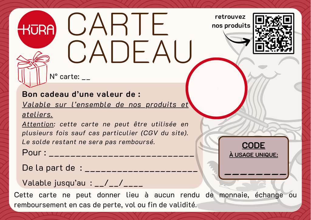 A offrir pour toutes les occasions, la carte cadeau de KURA de Bourgogne est valable pour tous nos produits et ateliers.